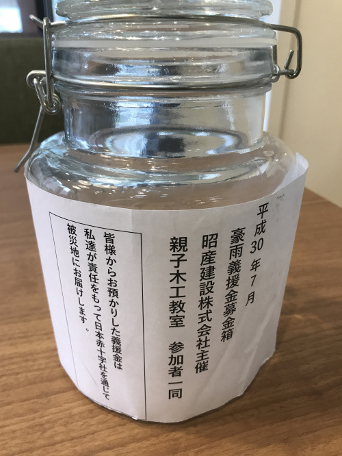 「平成30年7月豪雨災害義援金」にご協力頂きました第11回 大工さんと作ろう!親子木工教室の参加者の皆様本当にありがとうございました。皆様にご協力頂き集まった義援金の合計は\14,086-でした。